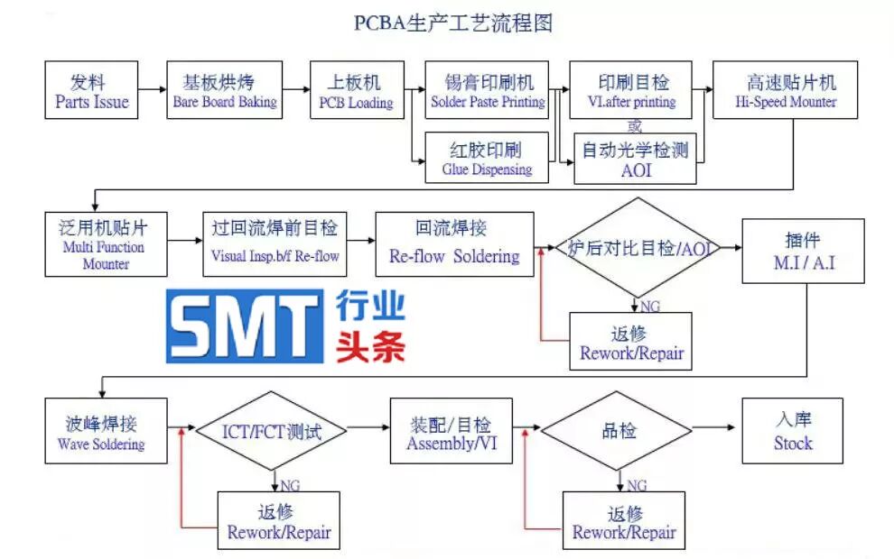SMT首件检测仪——>印刷(红胶/锡膏)——>检测(可选3D-SPI全主动或人工检测)——>贴装(先贴小器材后贴大器材)——>检测(可选AOI 光学/目视检测)——>焊接(选用热风回流焊进行焊接)——>检测(选用AOI 光学检测外观及功能性测验检测)——>修理(运用东西;焊台及热风拆焊台等)——>PCBA分板(手艺或者全主动分板机进行切板)